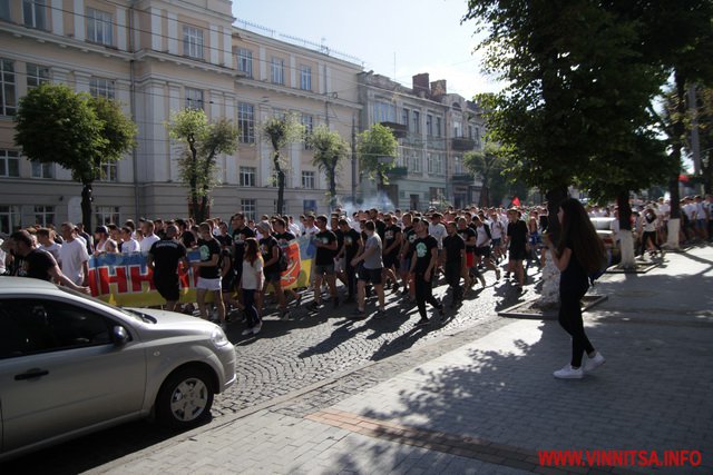 Около 100 футбольных фанатов, которых в народе называют «ультрас», провели шумное шествие по улице Соборной, маршируя от арки в Центральный городской парк к стадиону «Локомотив» с использованием кричалок, барабанов и петард.