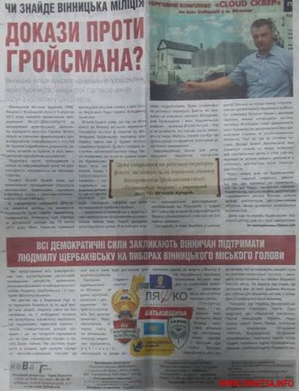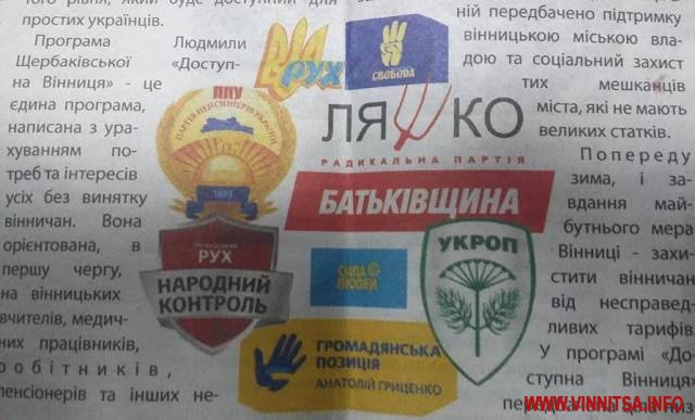 У спецвипуску видання «Нова Вінницька газета» від 5 листопада вміщено публікацію під заголовком «Всі демократичні сили закликають вінничан підтримати Людмилу Щербаківську на виборах міського голови», у якій йдеться про те, що «представники всіх демократичних сил, волонтерських організацій, громадських активістів» закликають підтримати у другому турі виборів міського голови Вінниці кандидатуру висуванки ВО «Батьківщина» Людмили Щербаківської та її програму «Доступна Вінниця».
