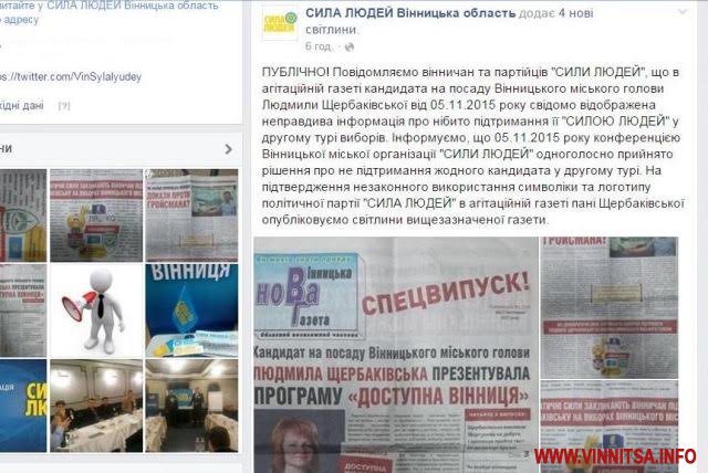 У відповідь на публікацію цього звернення обласний осередок партії «Сила людей» на своїй сторінці у мережі «Facebook» оприлюднив заяву такого змісту: «Публічно! Повідомляємо вінничан та партійців «СИЛИ ЛЮДЕЙ», що в агітаційній газеті кандидата на посаду Вінницького міського голови Людмили Щербаківської від 05.11.2015 року свідомо відображена неправдива інформація про нібито підтримання її «СИЛОЮ ЛЮДЕЙ» у другому турі виборів. Інформуємо, що 05.11.2015 року конференцією Вінницької міської організації «СИЛИ ЛЮДЕЙ» одноголосно прийнято рішення про не підтримання жодного кандидата у другому турі. На підтвердження незаконного використання символіки та логотипу політичної партії «СИЛА ЛЮДЕЙ» в агітаційній газеті пані Щербаківської опубліковуємо світлини вищезазначеної газети».