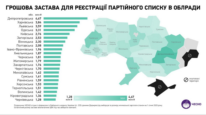 Розрахунки ЧЕСНО на основі формули із Виборчого кодексу України свідчать, що розмір застави для кандидата у міські голови облцентру чи великого міста від 90 тисяч виборців буде становити щонайменше 170 тисяч гривень (Ужгород). Рекордною буде застава для кандидатів у міські голови Києва — понад 4 мільйони гривень. У Вінниці застава для кандидата в мери становитиме 529 тис. грн.