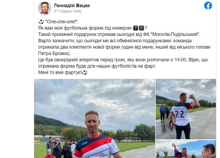 «Варто зазначити, що сьогодні ми всі обмінялися подарунками: команда отримала два комплекти нової форми (один від мене, інший від міського голови Петра Бровка)», – йдеться, зокрема, у дописі на сторінці Геннадія Вацака.