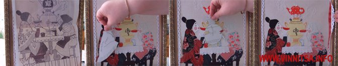 Далее, нужно изготовить шаблоны, т.е. вырезать отдельные детали и с помощью копирки перенести их на картон. Затем заготовки из картона переносим на лоскутки и все детали вырезаем. Хотим отметить, что все шаблоны из лоскутков должны быть подкрахмалены. Затем по контуру рисунка наносим клей ПВА и сверху приклеиваем все детали из лоскутков. Когда все подсохнет, все детали по краям нужно закрепить обметочным швом. Некоторые мелки детали нужно вышивать нитками мулине. Когда картина полностью готова на некоторые детали добавляем кружево и бахрому. Картину вставляем в рамочку, вот и все наша картина полностью готова.
