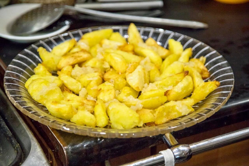 1 кг невеликих картоплин миють, ріжуть начетверо, миють, трішки обсушують, опускають в киплячу соняшникову олію (0,5 л), що кипить у чавунному казанкові. Смажать картоплю до золотавого кольору. Потім виймають шумівкою, кладуть в тарілку, поливають часниковою підливою, накривають кришкою на 1-2 хвилини, дають протятися часником.