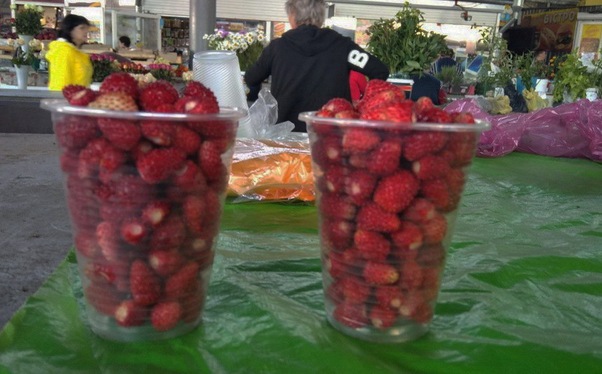 «А оу мене з Вінницьких лісів суничка. Поки встигла назбирати лише два маленьких стаканчики пластмасових. Віддаю по 70 гривень за один», - каже продавчиня по сусідству.