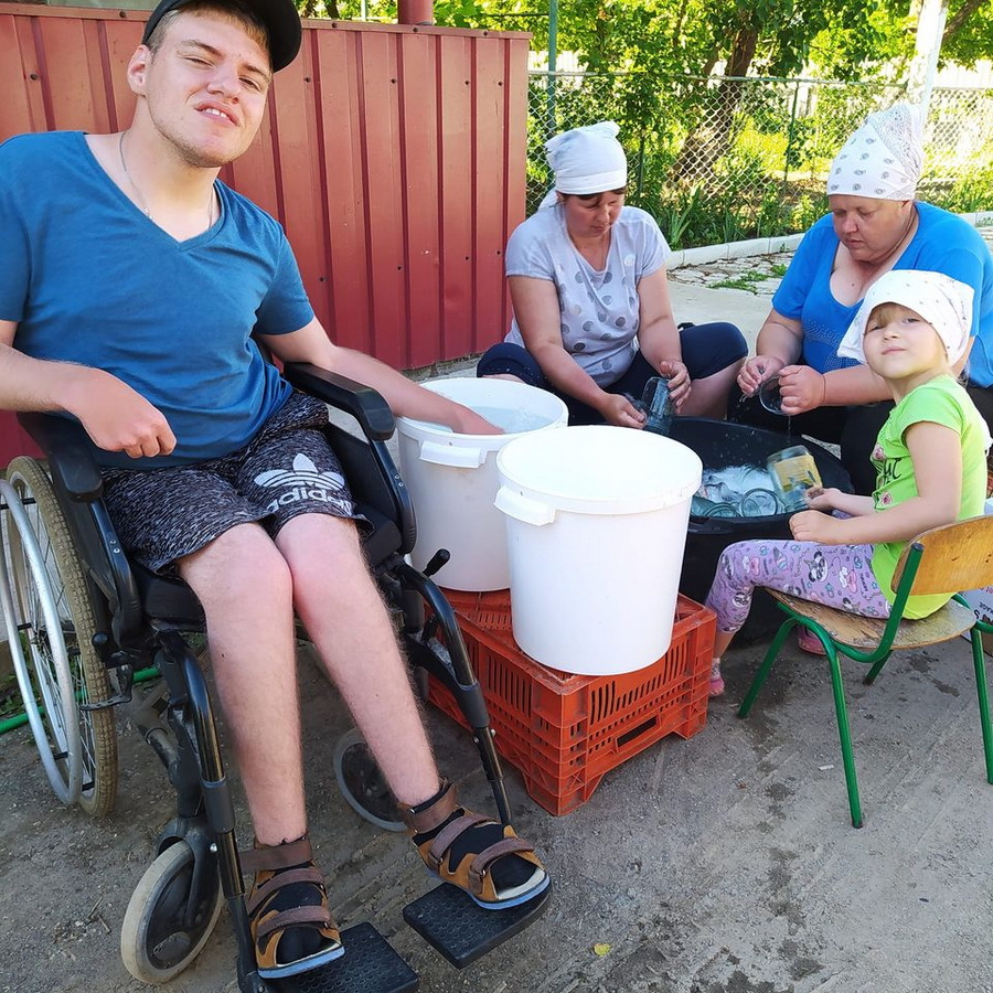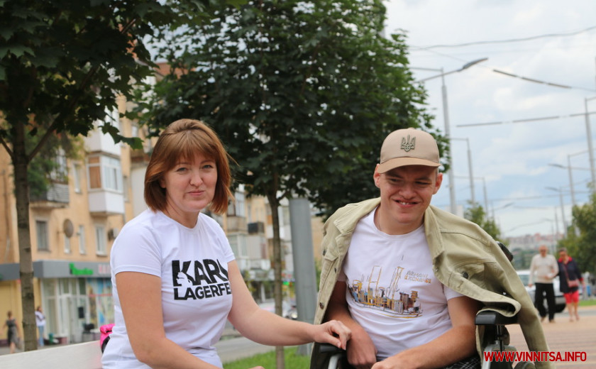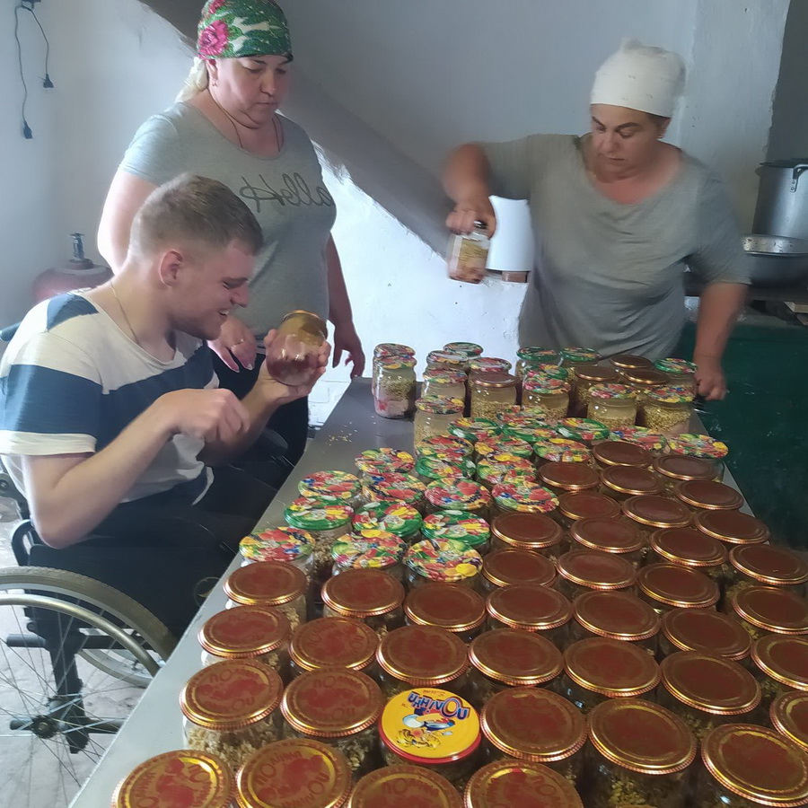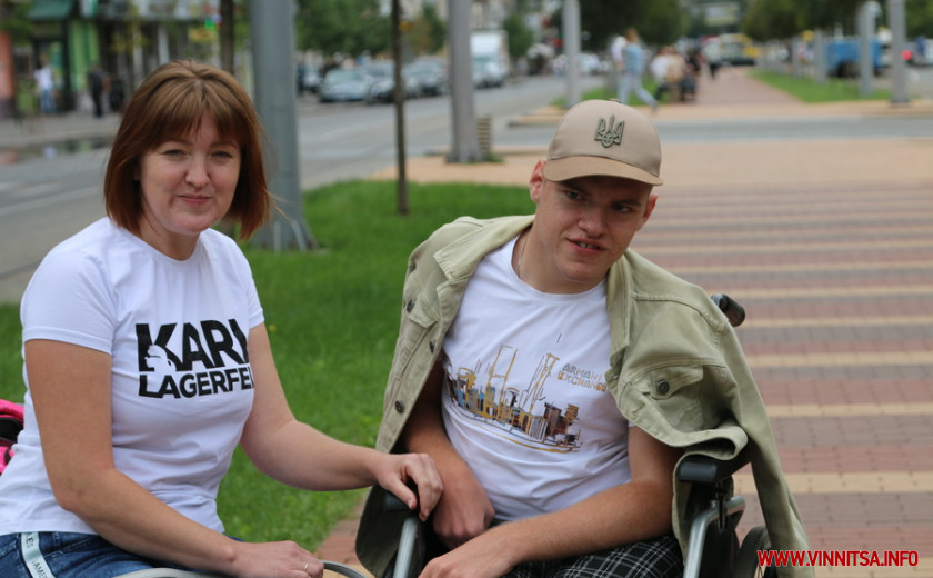 Наталія Горовенко тримає 19-річного сина Богдана за руку. Хлопець пересувається на кріслі-колісному. Він з народження має діагноз ДЦП. Проте він комунікабельний, гарно говорить українською мовою і займається волонтерством – допомагає готувати тушонки для наших захисників. «Закуска бандерівська. З любов’ю до України» - понад 9000 банок тушонки зробили волонтери, яким допомагав Богдан.