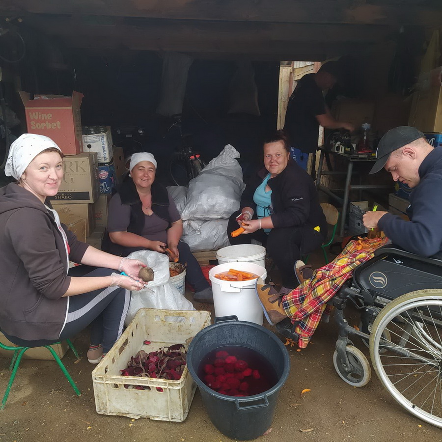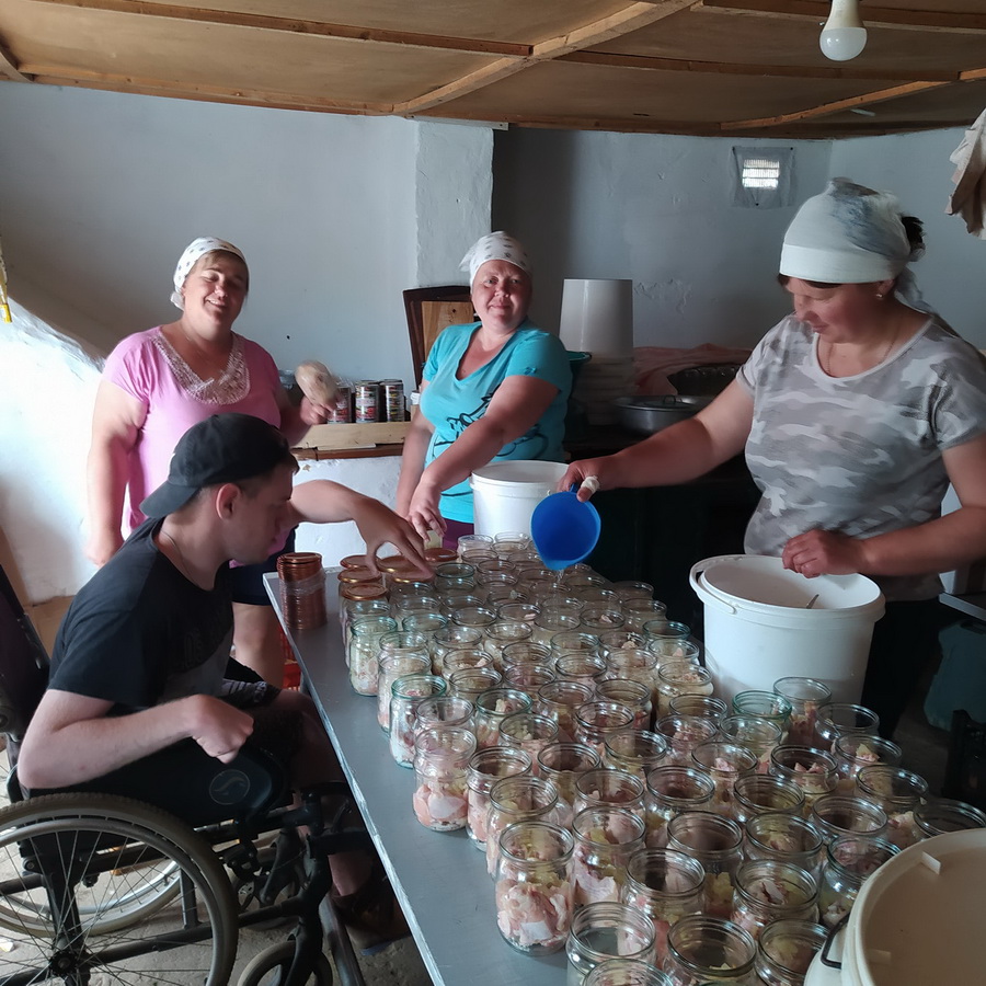 «Коли розпочалась війна, родичі забрали нас до себе в село Дубовець, Немирівського району. Уже там ми спершу допомогли приготувати обід переселенцям: деруни, вареники. А потім нам привезли м’яса і попросили зробити тушонку. І так все закрутилось. Працювали із нами сусіди, куми, кілька сімей. Хтось постійно допомагає, хтось час від часу приходить. Потім наш фермер придбав свиню і ми її переробили на тушонки, потім ще нам придбали три свині. І так закипіла робота. Пізніше і люди почали фінансово допомагати. Хтось приносив банки, хтось овочі. Село невеличке але нас підтримали чимало осіб і ми дуже їм вдячні. А от Богданчик теж брав участь у цьому процесі. Не сидів склавши рук, просив дати хоч якусь роботу», - розповідає Наталія Горовенко.Попри те, що кожний рух хлопцеві дається нелегко, він наполегливо вирішив займатися волонтерством.