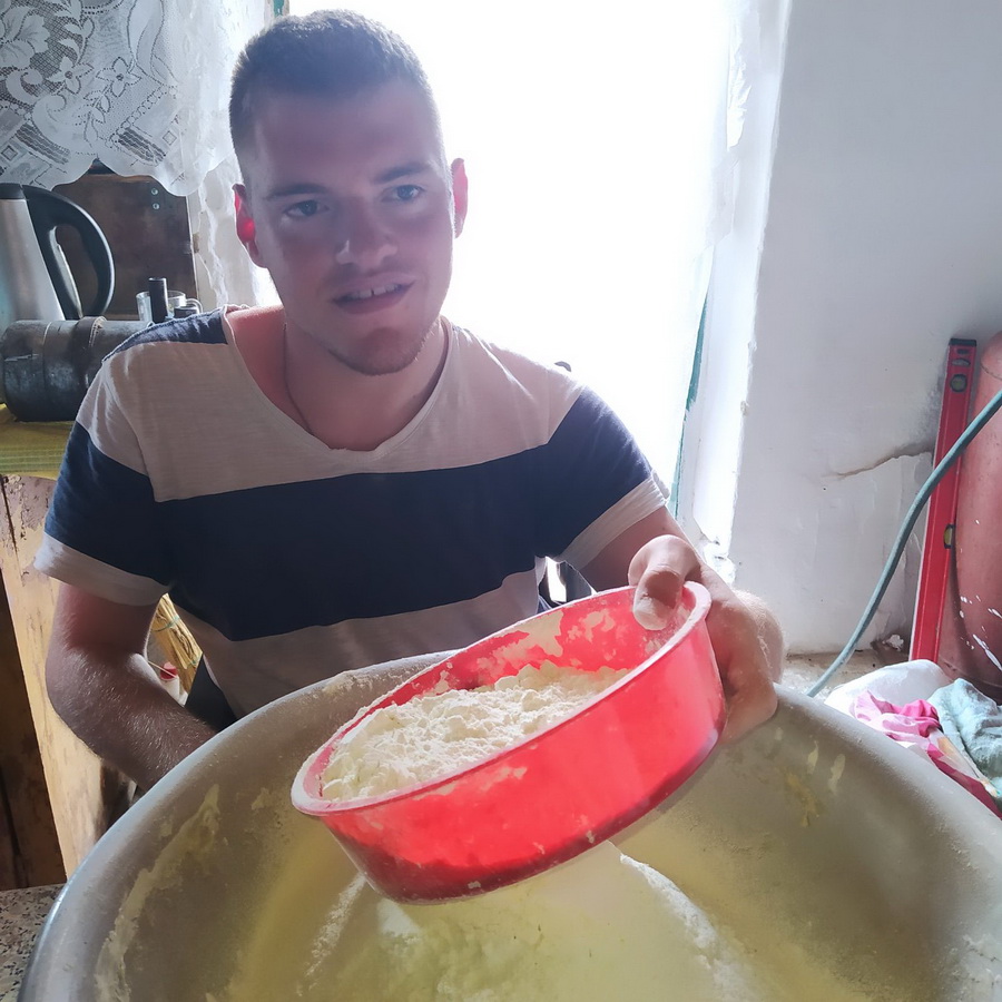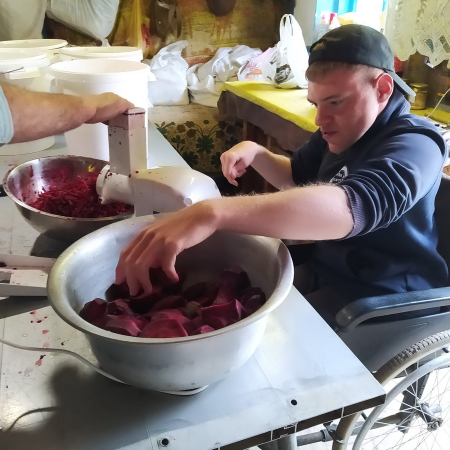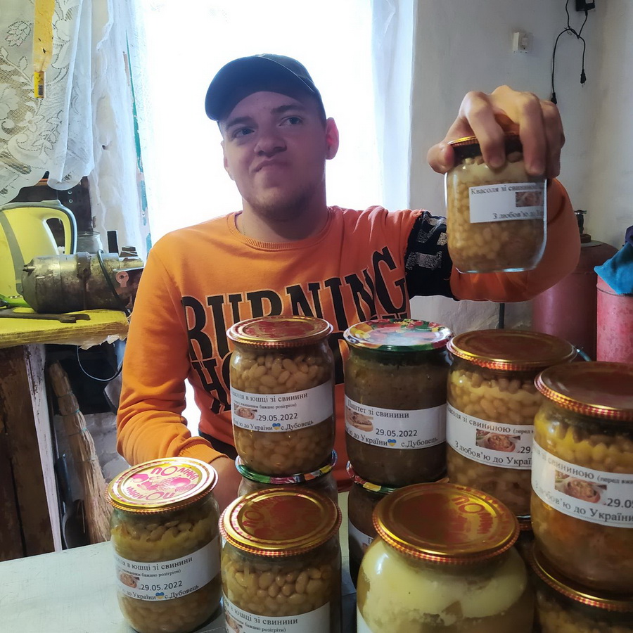 «Я теж захотів бути корисним. Тому допомагав і допомагаю по сьогодні складати тушонку в ящики, полоскати банки, перекручувати на електром’ясорубці сало та м'ясо, я закидав і контролював цей процес. Перекручував овочі. Сам якось перекрутив цілий мішок моркви. Ще допомагаю з ліпленням вареників, просіваю борошно, пробую розкачувати тісто. Трішки буває втомлююсь, але мені дуже подобається працювати, знаючи, що це попрямує до наших воїнів».