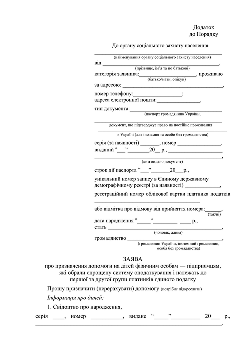 Електронний: заява і фотокопії документів подаються через електронний сервіс - Електронна послуга «Допомога на дітей фізичним особам-підприємцям» - https://dopomoga2fop.ioc.gov.ua
