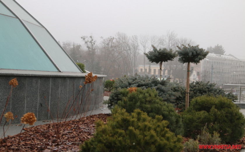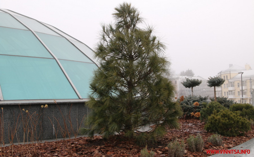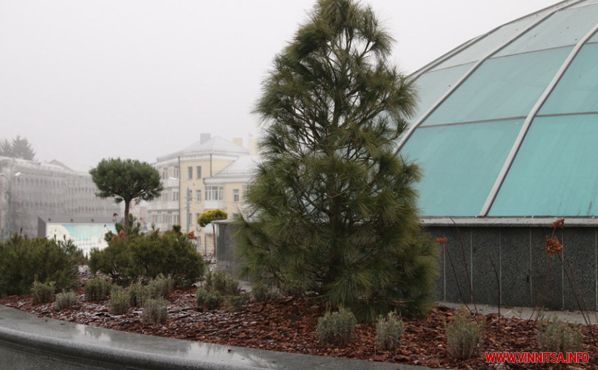 До Нового року залишається не так багато часу, а навпроти Універмагу у Вінниці, розсаджується хвойний палісадник. У колишній фонтан у формі «глобуса», що стоїть по центру площі, нещодавно посадили ялинки, сосни та туї. А нині, там ще з'явилися кущі.