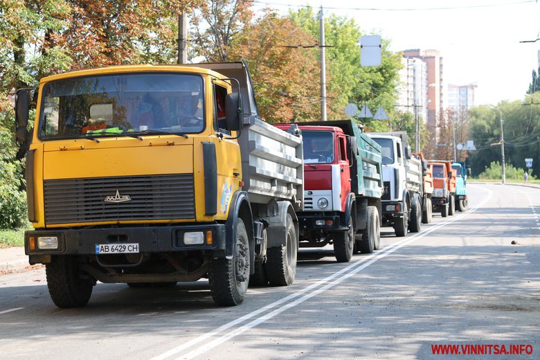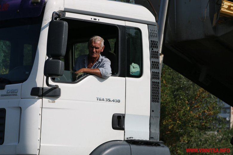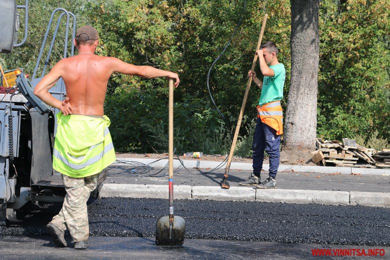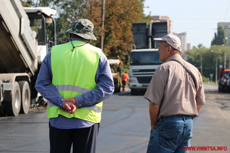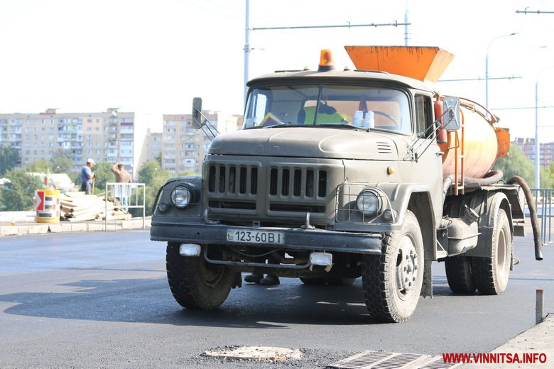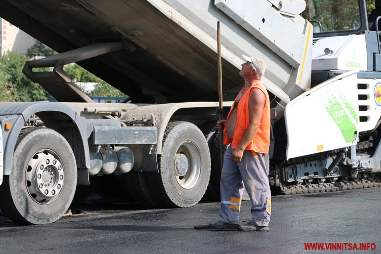 Близько 8 видів транспортної техніки задіяно у роботі: одні привозять асфальт, стелять третій шар, інші утрамбовують та вирівнюють. Робочі, яких близько 20-ти чоловік, встановлюють перила із вінницьким гербом, підключають LED-ліхтарі, розгортають лопатами асфальт.