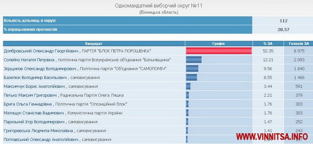 По 11 ОВО з центром в м. Вінниця ЦВК опрацьовано 27,67% голосів. Явним лідером є Олександр Домбровський висунутий партією Блок Петра Порошенка.