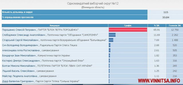 На 12 ОВО з центром у м. Вінниця вибори пройшли загалом спокійно, хоча до виборчої дільниці була неабияка увага всієї України. Адже по цьому Вінницькому округу до ради йшов син Президента – Олексій Порошенко.