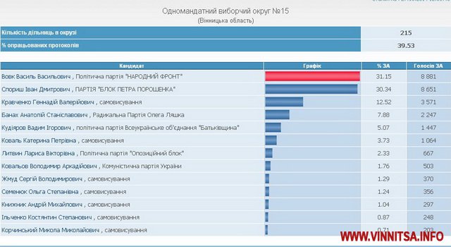 На 15 ОВО з центром в м. Шаргород поки що не можна визначити явного лідера виборчих перегонів. ЦВК опрацювала 37,67% голосів. За попередніми результатами лідирує Василь Вовк, висуванець партії «Народний фронт» - 31, 96% (8222) голосів. За ним з невеликим відривом йде представник Блоку Петра Порошенка Іван Спориш – 28,69% (7381) голосів. За інформацією ОПОРИ, на даному окрузі в день виборів висіли білборди із зображенням В. Вовка, що є порушенням і могло вплинути на волевиявлення виборців.