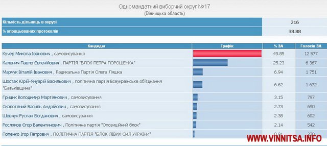 На 17 ОВО з центром в м. Ладижин ЦВК опрацювала 38,88% голосів. Там за попередніми результатами лідирує директор МХП «Миронівський хлібопродукт» самовисуванець Микола Кучер.