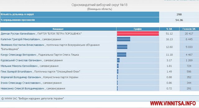 На 18 ОВО з центром в м. Іллінці теж можна з переконанням назвати лідера виборчих перегонів. По даному округу ЦВК опрацювала 54,36% голосів. Перемогу тут отримав Руслан Демчак з попереднім результатом 52,12% (20417) голосів.