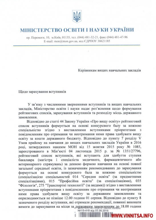 У Вінницькому національному медичному університеті ім.Пирогова в приймальній комісії повідомили, що не отримували листа з Міністерства освіти та науки України про те, що абітурієнти, які не вступили на бюджет, отримали можливість вступити на вільні бюджетні місця за спеціальностями, де недобір.