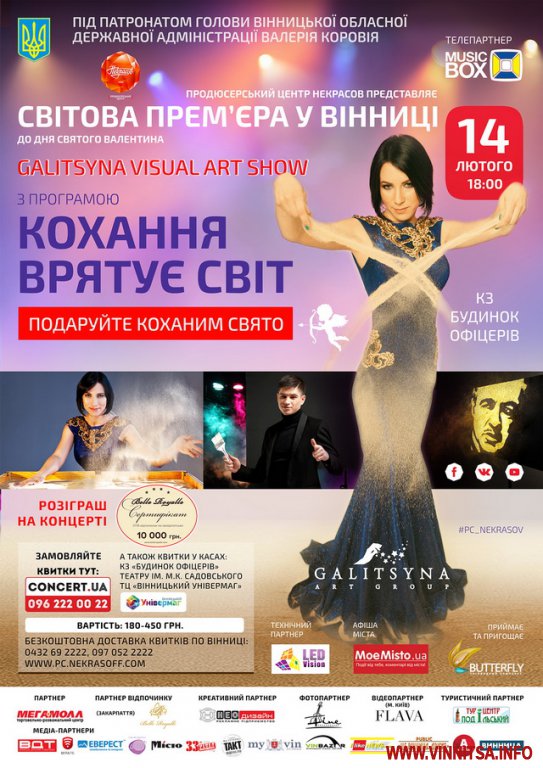 Яскравий подарунок вінничанам підготував продюсерський центр «Некрасов». Спеціально до Дня закоханих, на сцені вінницького Будинку офіцерів відбудеться прем’єрний показ нової шоу-програми світового рівня від «Galitsyna Visual Art Show».