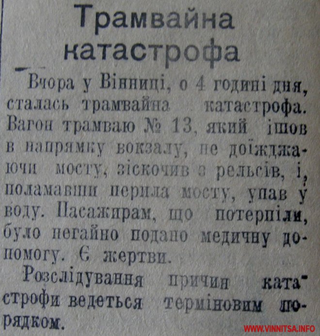 В травні 1938 року на мосту сталася жахлива аварія. Вагон трамваю №13, що рухався в напрямку залізничного вокзалу, зіскочив з рейок, проламав перила і впав у річку. Загинули дві людини.