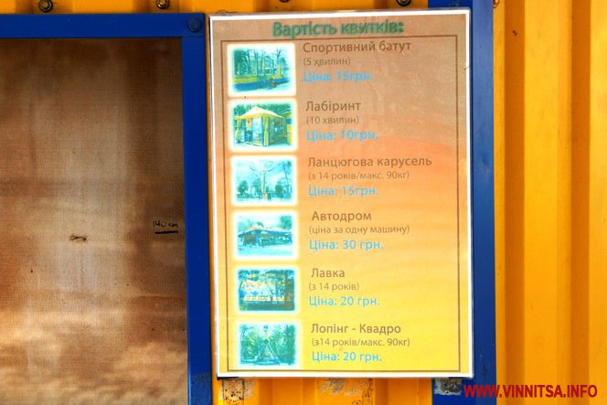 Наразі більшість гойдалок і каруселей обтягнуті плівкою від дощу. Каси зачинені. На огорожах деяких атракціонів розміщенні повідомлення про їх технічний стан. Згідно вивісок, востаннє їх перевіряли ще в квітні 2015 року.