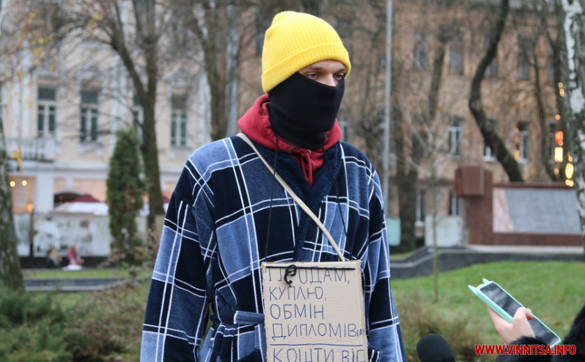 Згодом до Олексія «підтягнулися» інші студенти. Усі роздавали перехожим дипломи зі словами «Кому безкоштовний диплом про вищу освіту?».