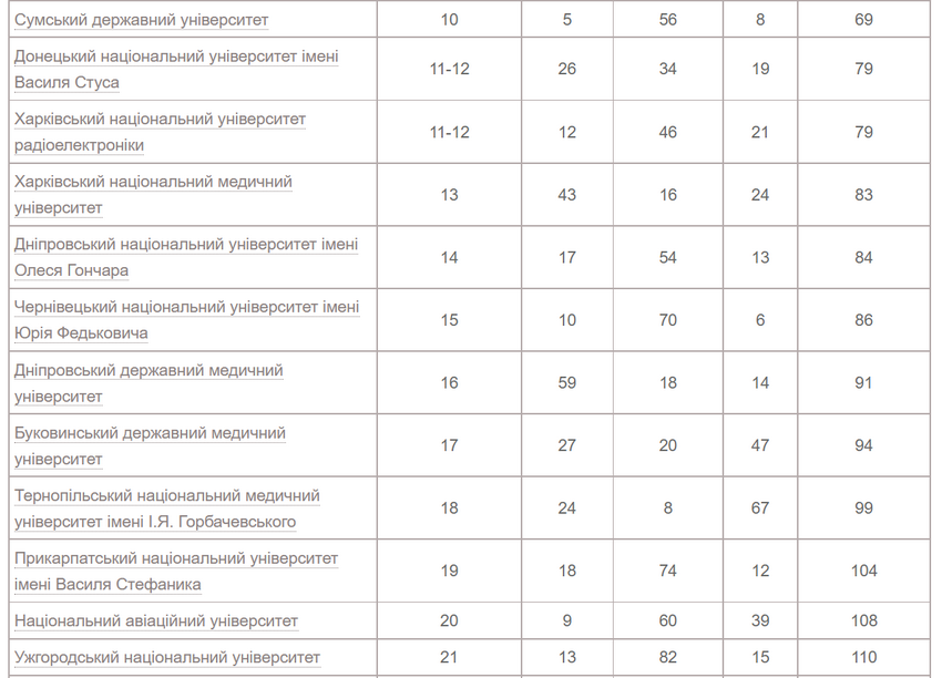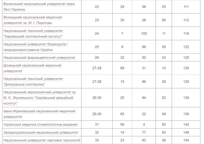 Четверте та п'яте місця поділили Харківський національний університет ім. Каразіна та Національний університет «Києво-Могилянська академія».