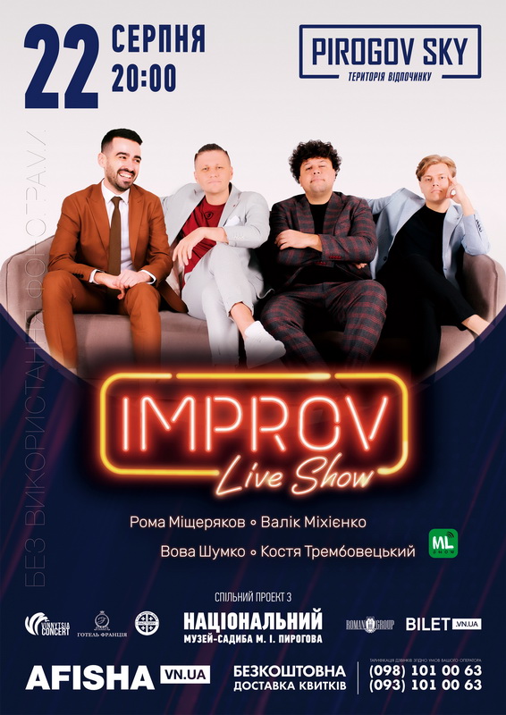 Не пропустіть великий концерт IMPROV LIVE SHOW у неділю, 22 серпня, о 20:00 у PIROGOV SKY – просто неба у музеї-садибі Пирогова.