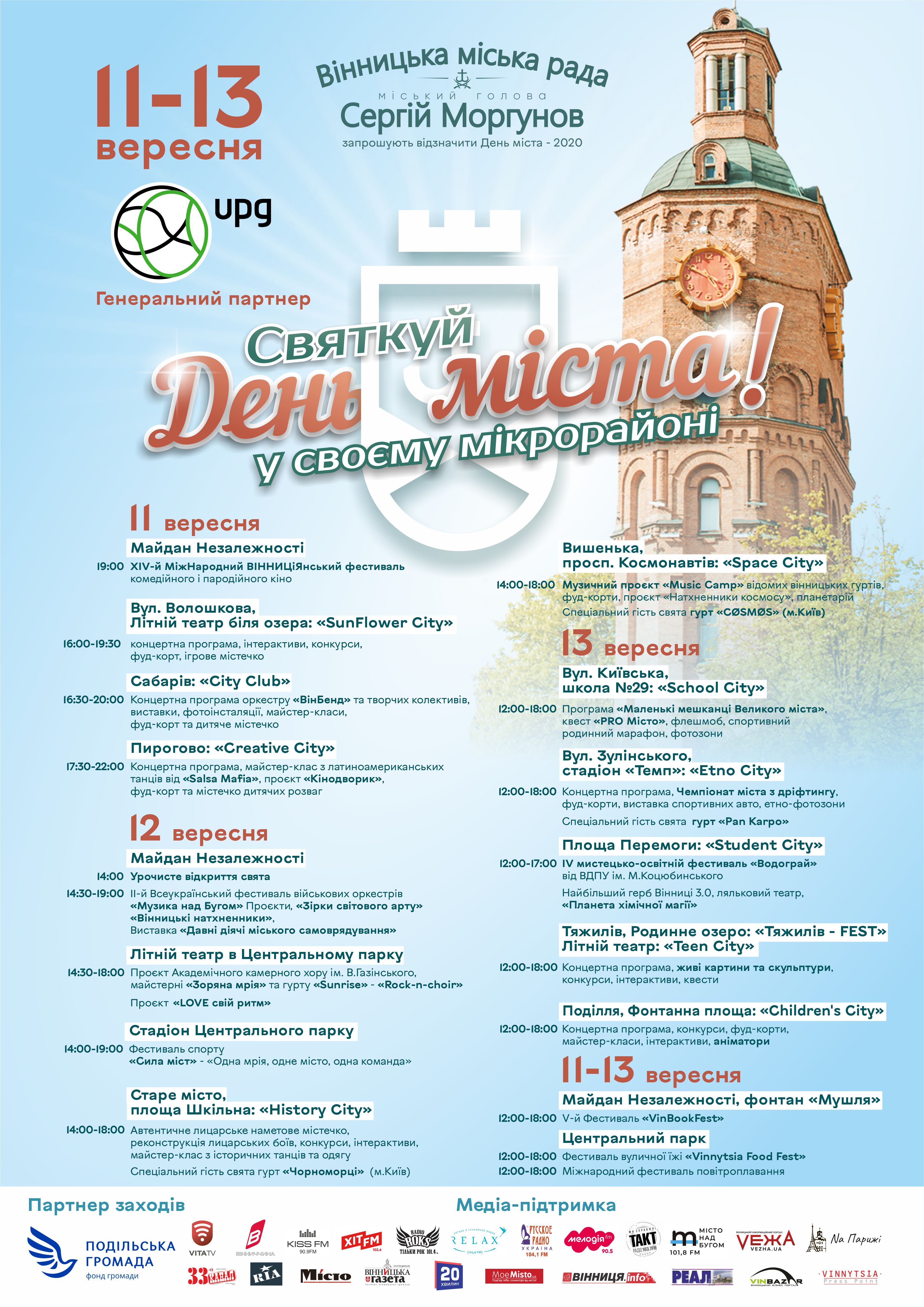 День міста у Вінниці цього року відбудеться не в традиційному форматі. Замість одного дня святкувань – три – 11,12 і 13 вересня. Заходи будуть проходити по всьому місту, аби люди могли поруч з домом відчути атмосферу свята. На вінничан чекають концерти, інтерактиви, конкурси, майстер-класи, квест.