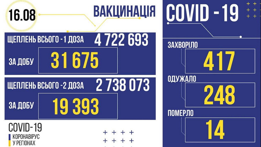 Загалом, протягом доби в Україні за добу одужали 248 людей. Захворіли – 417. Померли –14. Вакцинувалися протягом доби – 31 675+19 393.