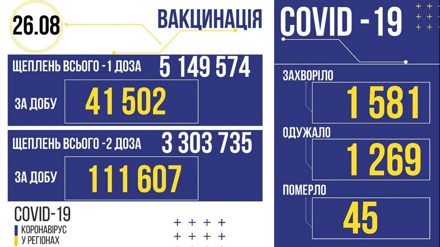 Загалом, протягом доби в Україні за добу одужали 1 269 людей. Захворіли – 1 581. Померли – 45. Госпіталізовано 464.