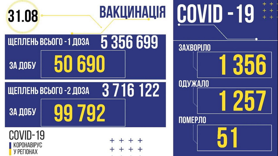 Загалом, протягом доби в Україні за добу одужали 1 257 людей. Захворіли – 1 356. Померли – 51. Госпіталізовано 470. Вакцинувалися протягом доби – 50 690+ 99 792.
