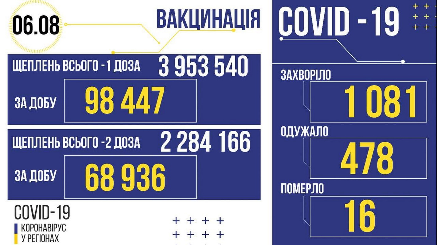 Загалом, протягом доби в Україні за добу одужали 478 людей. Захворіли – 1 081. Госпіталізовано – 516. Померли – 16. Вакцинувалися протягом доби – 98 447 + 68 936.