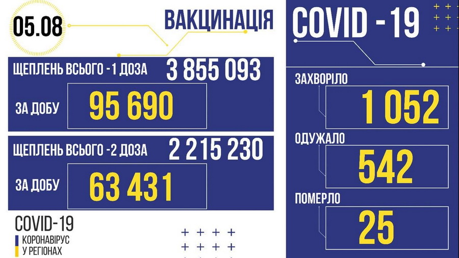 Загалом, протягом доби в Україні за добу одужали 542 людей. Захворіли – 1 052. Померли – 25. Вакцинувалися протягом доби – 95 690+ 63 431.