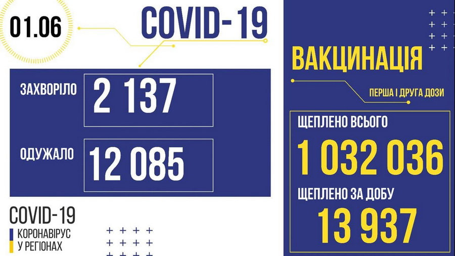 В Україні за добу одужали 12 085 людини. Захворіли – 2 137. Померли – 163. Щеплено – 10 232 + 3 705. Загалом проведено 1 032 036.