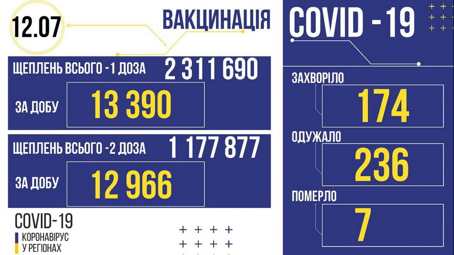 Загалом, протягом доби в Україні за добу одужали 236 людей. Захворіли – 174. Померли – 7. Вакцинувалися протягом доби першою дозою – 13 390 + 12 966.