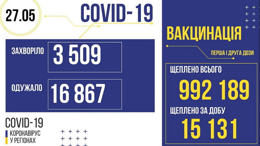 В Україні за добу одужали 16 867 людини. Захворіли – 3 509. Померли – 183. Щеплено – 4 998 + 10 133. Загалом проведено 992 189 вакцинацій.