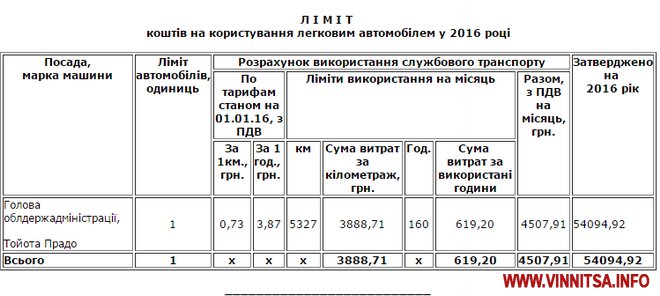 У 2016 році голові ОДА дозводяється «наїздити» на 54094,92 гривень.
