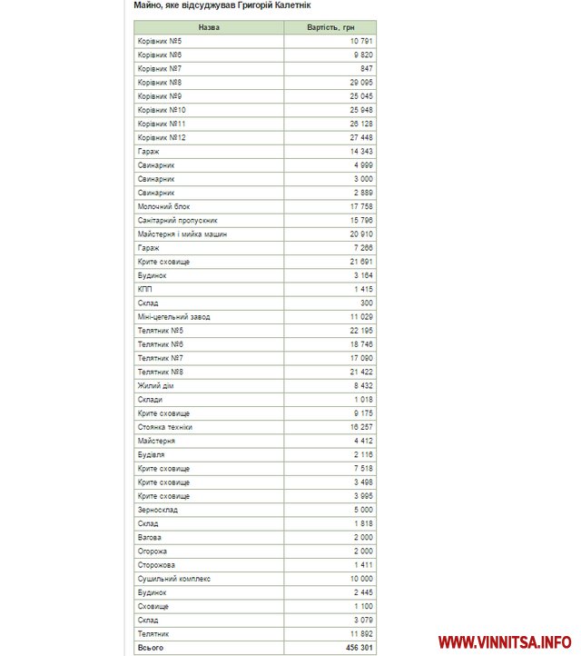 Хоча за даними судового рішення, загальна сума майна, яке нібито викупив Григорій Калетнік у селян, становила 466 929 грн. Якщо ж рахувати окремо за кожним об'єктом, то сума виходить ще менша - 456 301 грн.
