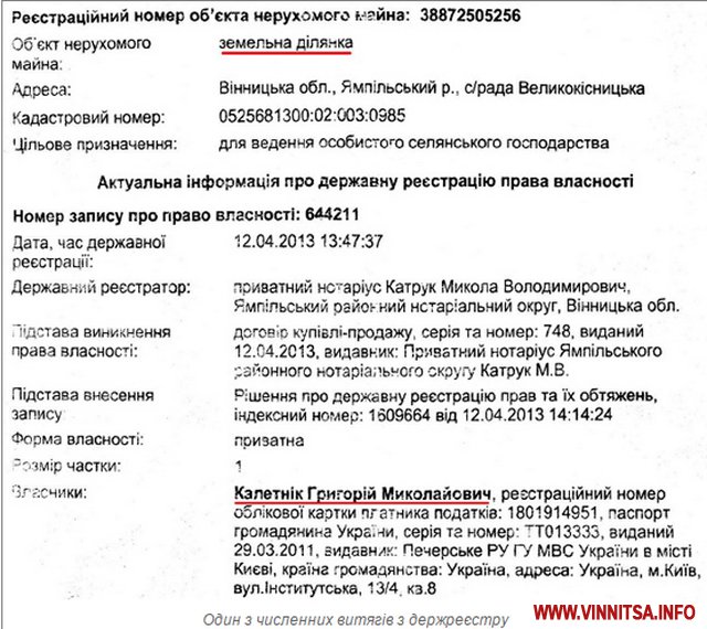 Наразі все майно селян переоформлене на Григорія Калетніка, про що свідчать витяги з державного реєстру речових прав на нерухоме майно.