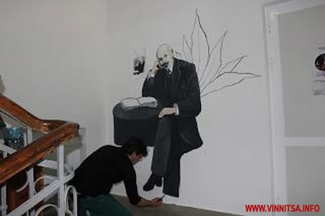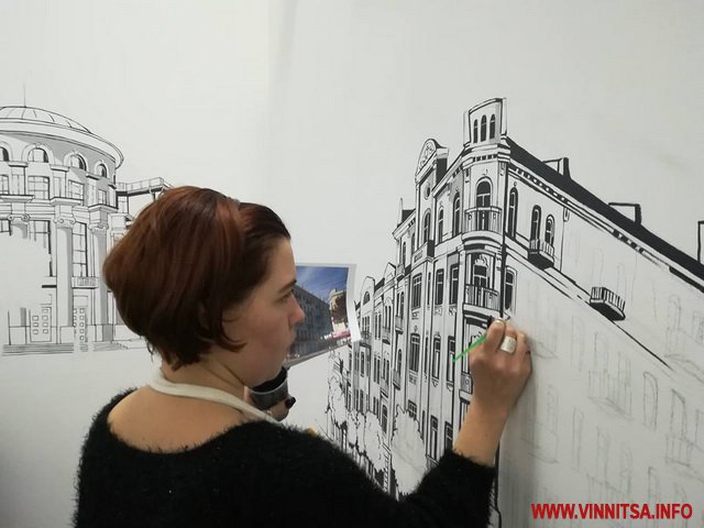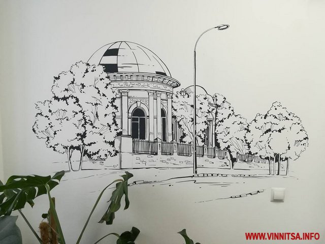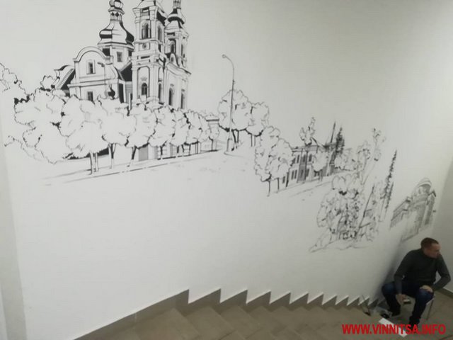 «Нещодавно у приміщенні зробили прекрасний ремонт. Було вирішено розмалювати стіни. З колегами Олександром Марченко та Іриною Прокопчук вирішили, що зображення будуть у стилі графіки. Тобто – чорно-білі. Адже самі стіни яскраво білі, вони мають гладку текстуру. У цьому випадку, різнобарв’я може лише зіпсувати загальну картину. Тому і вирішили притримуватися цієї концепції», - розповів Вінниця.info художник Олександр Никитюк.