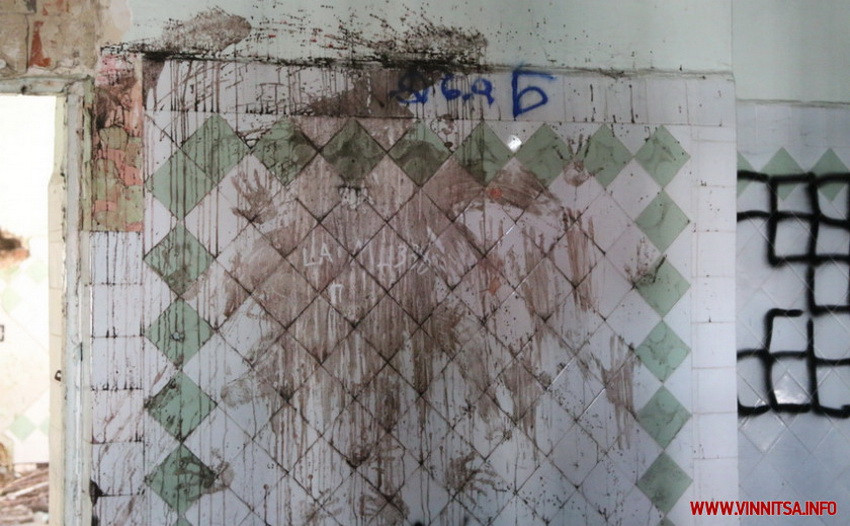 На першому поверсі, в приміщенні, яке колись могло слугувати кухнею або їдальнею, судячи з плитки, якою вимостили стіни, хтось по собі залишив зображення, визначення якого можна охарактеризувати на межі «моторошного» та «огидного».