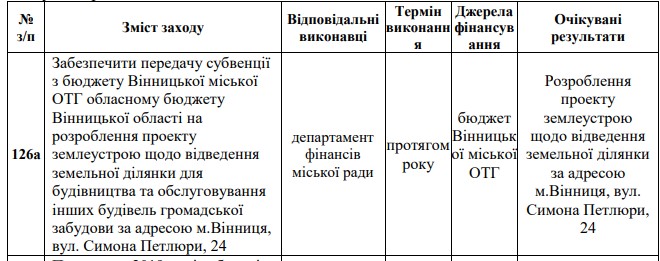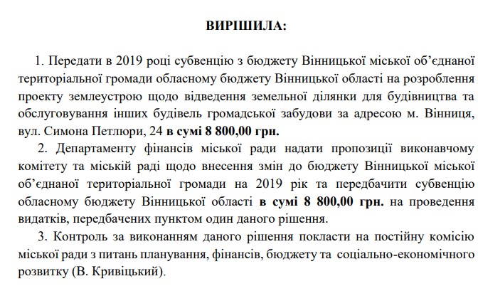 В березні 2019-го року в міській раді вирішили «забезпечити передачу субвенції з бюджету Вінницької міської ОТГ обласному бюджету Вінницької області на розроблення проекту землеустрою щодо відведення земельної ділянки для будівництва та обслуговування інших будівель громадської забудови за адресою м. Вінниця, вул. Симона Петлюри, 24». Визначили і необхідну суму – 8 800,00 грн.