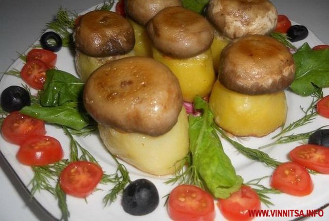 Заполнить картофелины начинкой.  Поставить в разогретую духовку запекаться на 15 минут. Шляпки обжарить на масле с обеих сторон, посолив.  Запеченные картофелины поставить на блюдо начинкой вверх.  Каждый "гриб" накрыть обжаренной шляпкой.