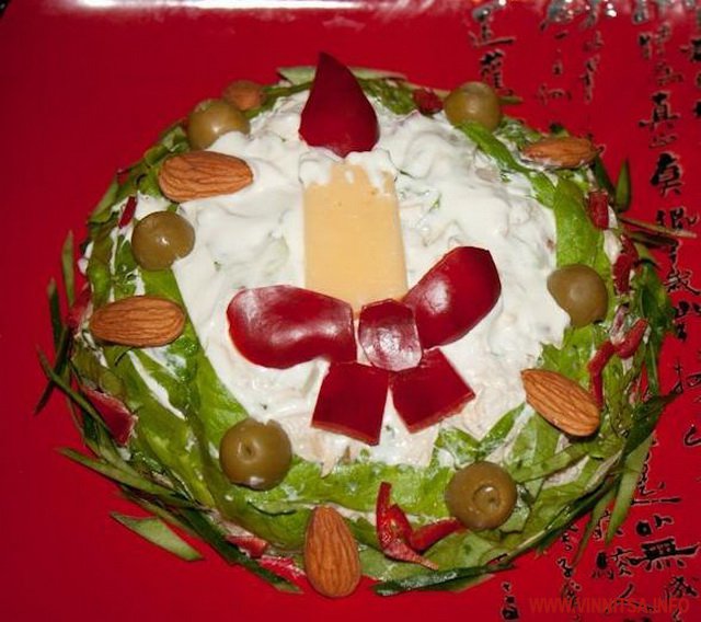 Из красного перца вырезать огонёк свечи и праздничный бант. Также, произвольно, украсить салат орехами и оливками.