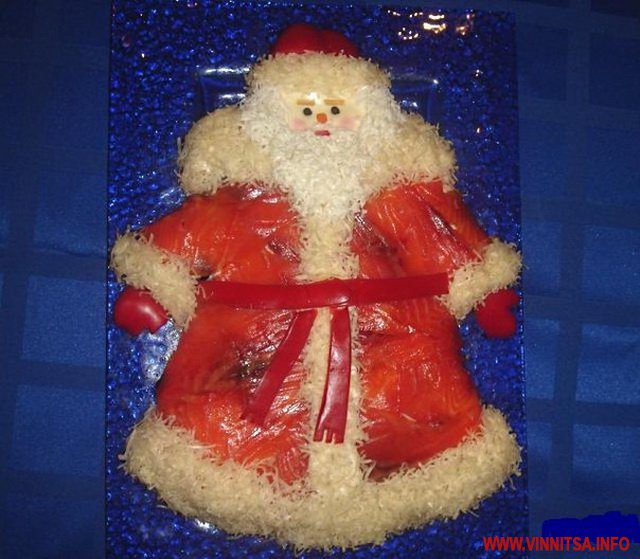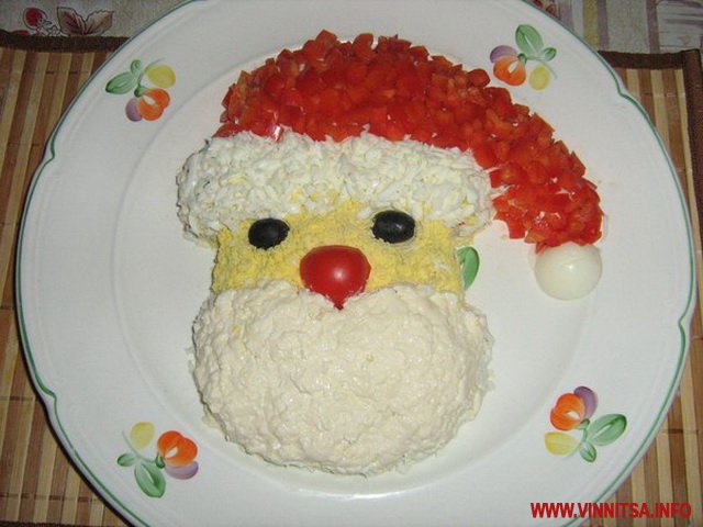 Украсить Деда Мороза. Пояс, рукавички и шапочку сделать из болгарского перца, опушку из сыра, потертого на терке, лицо из пластинки сыра, щёки из кусочков красной рыбы, нос из моркови, окрашенной свеклой, волосы и усы из белка яиц, глаза из горошины перца.