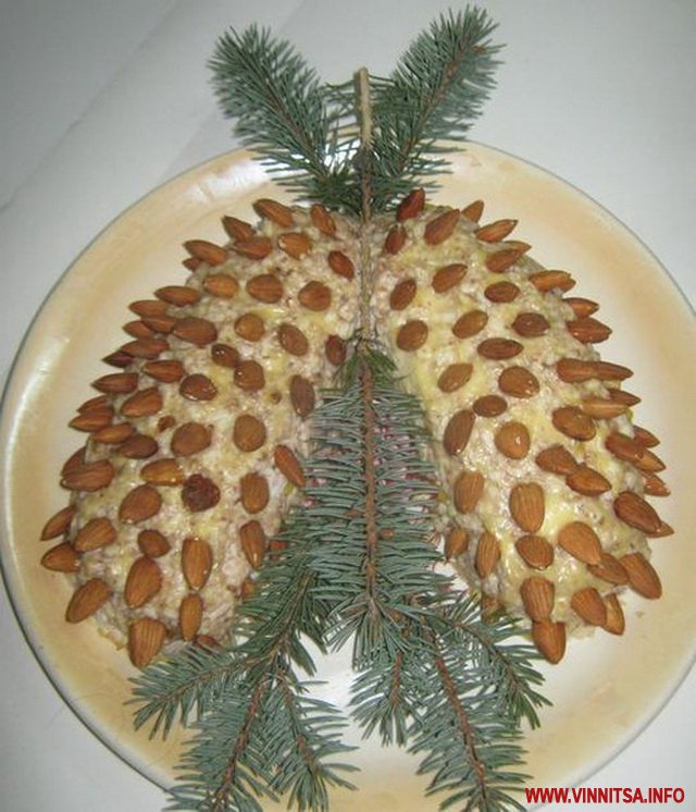 Салат выкладывать слоями в форме "ежика", в такой последовательности: