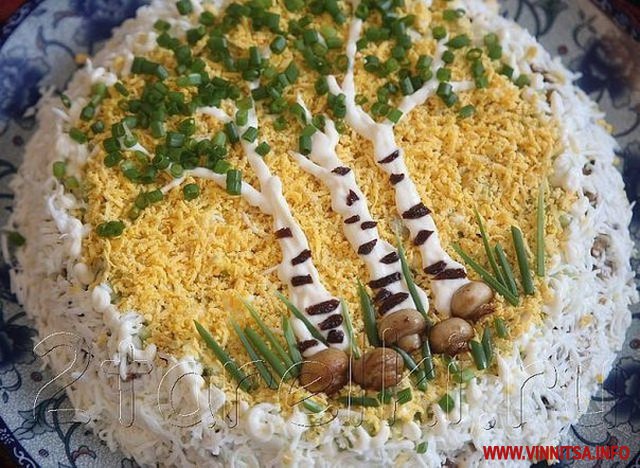 Сверху салат с куриным филе и грибами Березовая Роща украсить полосками чернослива, в виде ствола березы, листочками из зелени петрушки, не забудьте посадить грибочки и сделать траву из укропа.