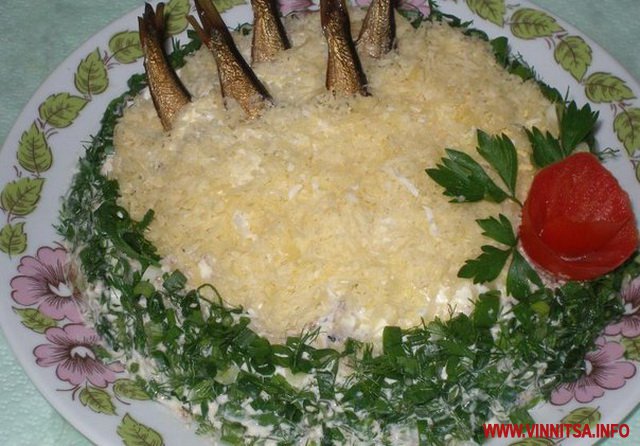 Кулинарный рецепт салата не требует особых хлопот. Сначала сварить «в мундире» 3-4 крупных картофелины, остудить их, чистить от шкурки и натереть на крупной тёрке. Укладывать в салатницу слой тёртой картошки и полить её сверху растительным маслом, а затем смазывать майонезом. Порезать огурчики небольшими кубиками и положить поверх картофеля, залить майонезом. Третьим слоем будут яйца, которые надо натереть на тёрке и тоже покрыть майонезом. Из банки шпрот вылить масло, отобрать несколько самых симпатичных рыбок, размять оставшиеся вилкой и выложить в салатницу очередным слоем. Смазать рыбный слой майонезом, а сверху посыпать тёртым сыром. Сделать берега из зелени, кувшинки – из томатов, запустить в пруд стайку резвящихся шпрот. Перед подачей на стол салат «Рыбки в пруду» лучше подержать в холодильнике пару часов, чтобы слои пропитались заправкой.
