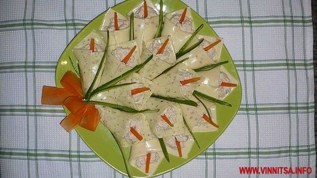 Завернуть начинку конвертиком, украшение из огурцов и вареной моркови. Бант из сырой моркови.