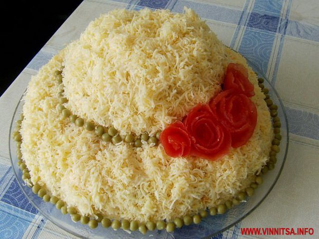 Верх салата посыпать тертым сыром, бока украсить дольками помидора.