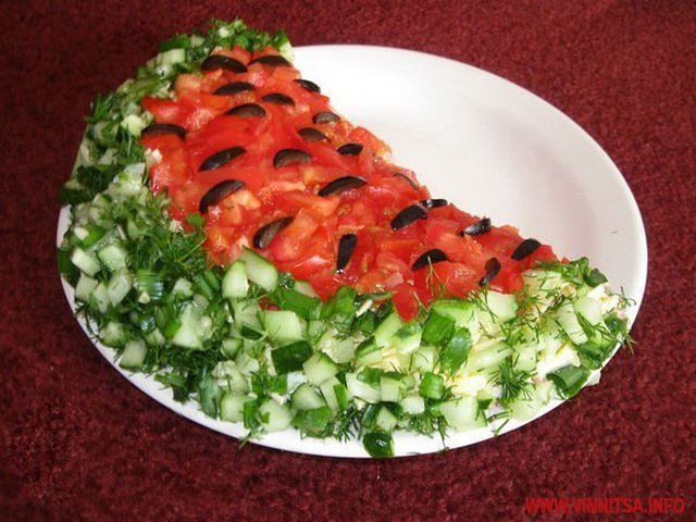 Салат выкладывать на блюдо слоями, формируя из него варежку.